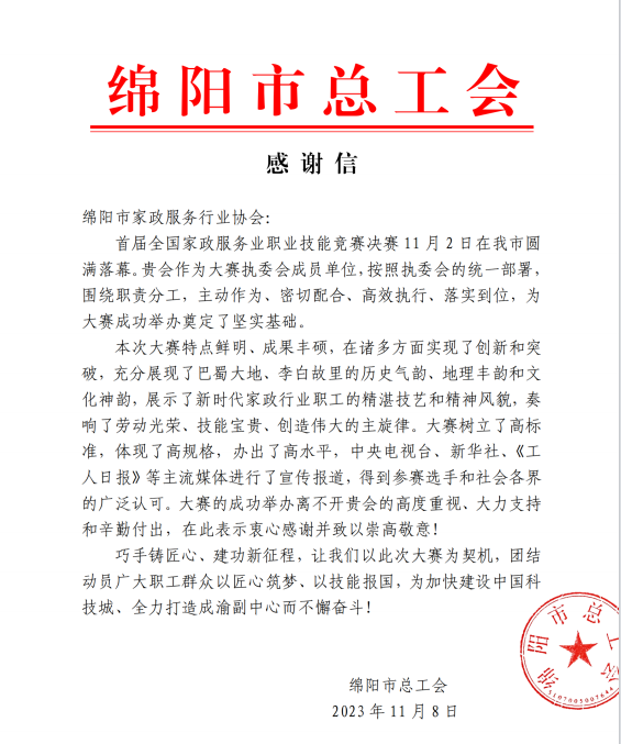 綿陽(yáng)市家政服務(wù)行業(yè)協(xié)會(huì)力助首屆全國(guó)家政服務(wù)業(yè)技能競(jìng)賽決賽在綿陽(yáng)圓滿(mǎn)落幕,綿陽(yáng)市總工會(huì)高度贊揚(yáng),綿陽(yáng)市美新家政熱烈祝賀!